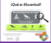 En la infografía creada por la Secretaría de Salud/ Subsecretaría de la Prevención y Promoción de la Salud, se exponen cuatro indicadores para definir la juventud. Se mencionan elementos para una buena salud y los factores de riesgos que la afectan, así como los porcentajes de sobrepeso y obesidad.